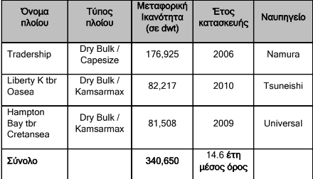 Μετά την ολοκλήρωση των επικείμενων συναλλαγών, ο στόλος της Εταιρείας θα αποτελείται από 7 πλοία με ένα LR2 δεξαμενόπλοιο, τρία Capesize, δύο Kamsarmax, και ένα Panamax), με συνολική μεταφορική ικανότητα 877.320 dwt τόνων περίπου.