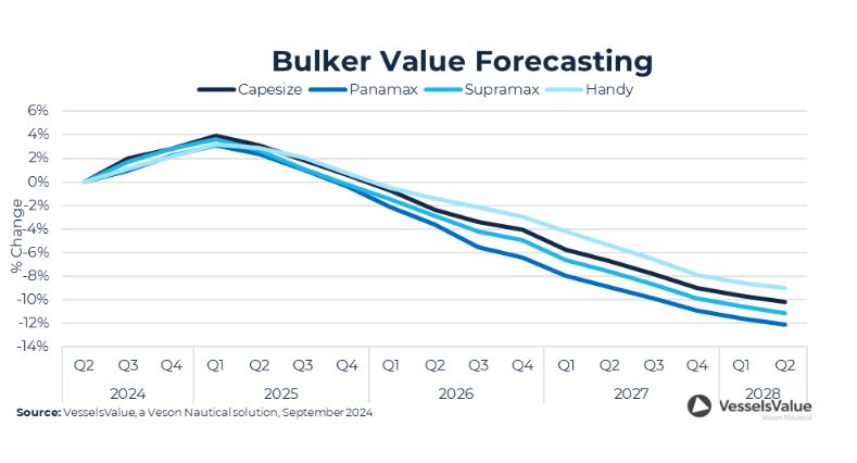 Οι αξίες των Bulker αυξήθηκαν σημαντικά το τελευταίο έτος λόγω της βελτίωσης του κλίματος, και παρά τις σταθερές προσδοκίες για τους ναύλους, η δυνητική άνοδος φαίνεται περιορισμένη λόγω των ήδη υψηλών επιπέδων. Οι μεταχειρισμένες αξίες αναμένεται επίσης να δεχθούν καθοδικές πιέσεις από τις μειωμένες τιμές των νεότευκτων πλοίων, όταν η δραστηριότητα παραγγελιών πλοίων μεταφοράς εμπορευματοκιβωτίων και πλοίων LNG υποχωρήσει.