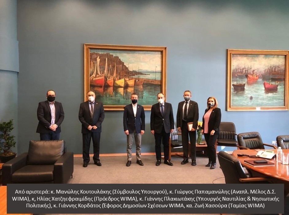 Την ανάγκη στήριξης των εταιρειών με διευκολύνσεις, επιδοτήσεις και απαλλαγές τόνισε το Διοικητικό Συμβούλιο της Διεθνούς Ναυτικής και Βιομηχανικής Ενώσεως (WIMA) κατά τη συνάντηση που πραγματοποιήθηκε με τον Υπουργό Ναυτιλίας & Νησιωτικής Πολιτικής, κ. Γιάννη Πλακιωτάκη, στο γραφείο του.