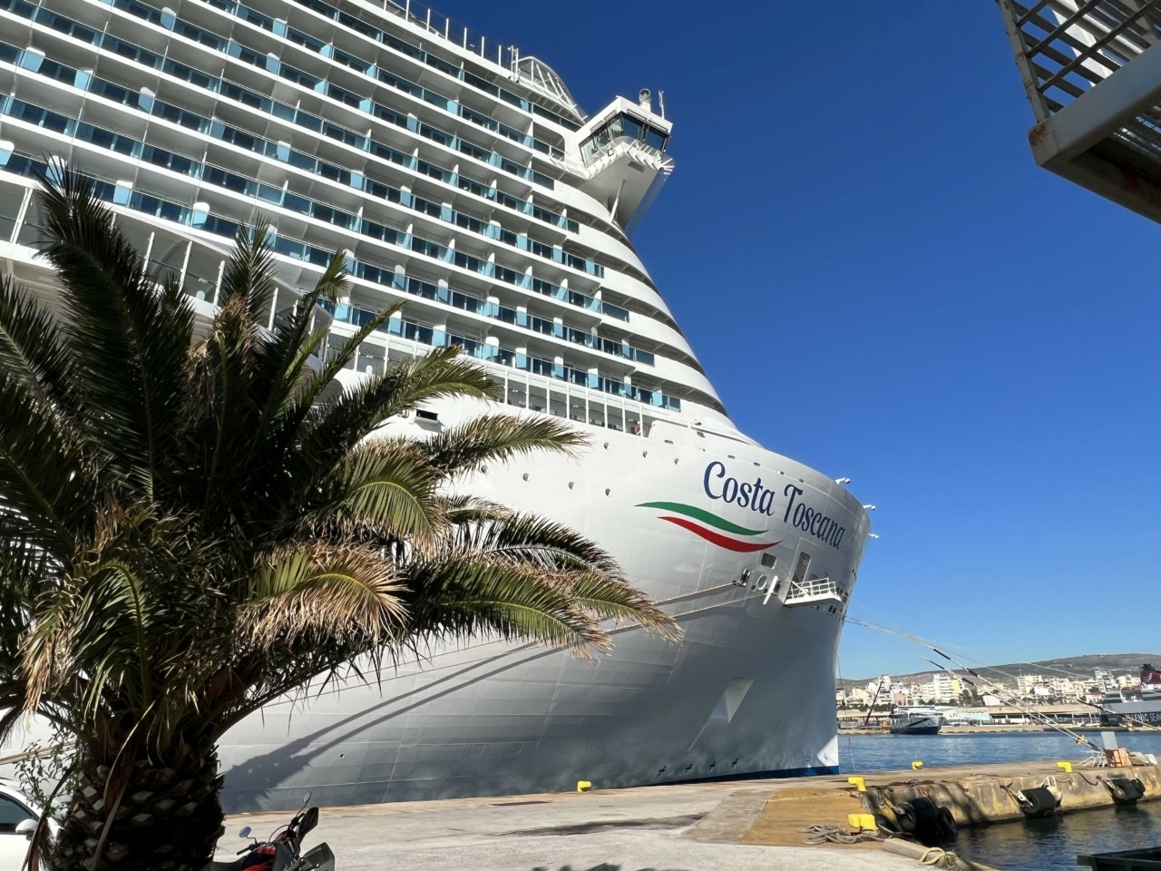 Η τεράστια θωριά του υπερσύγχρονου κρουαζιερόπλοιου Costa Toscana δέσποζε με την παρουσία της το πρωί της Παρασκευής στο λιμάνι του Πειραιά.