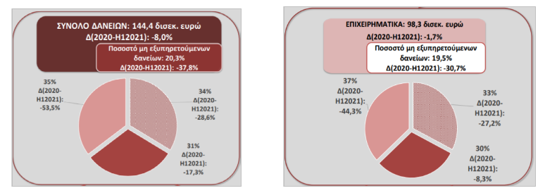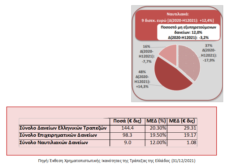 «Στον κλάδο της ναυτιλιακής χρηματοδότησης, το χαρτοφυλάκιο των Ελληνικών συστημικών τραπεζών το πρώτο εξάμηνο του 2021, ανέρχεται στα 9 δισ. ευρώ, σύμφωνα με την Έκθεση Χρηματοπιστωτικής Ικανότητας της Τράπεζας της Ελλάδος (31/12/2021) ενώ τα ΜΕΔ (Μη Εξυπηρετούμενα Δάνεια) του κλάδου αντιπροσωπεύουν το 12% του συνολικού ναυτιλιακού χαρτοφυλακίου των τραπεζών.
