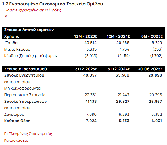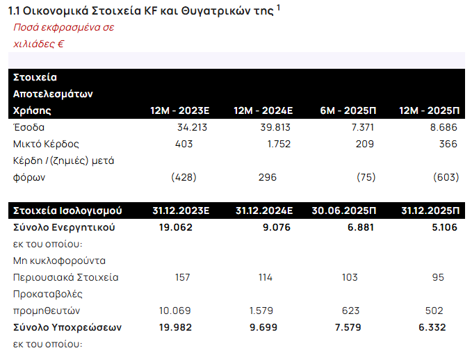 1. Συγκριτικά Οικονομικά Μεγέθη KF και Ομίλου. Όπως αναφέρεται στην από 24/02/2026 ανακοίνωση, η αποεπένδυση από την KF εντάσσεται στη στρατηγική απόφαση της Διοίκησης για αποδέσμευση από ζημιογόνες δραστηριότητες του εξωτερικού, λαμβάνοντας υπόψη την επιδείνωση των οικονομικών της μεγεθών και την αρνητική καθαρή θέση της εταιρείας κατά το χρόνο της μεταβίβασης. Στους παρακάτω πίνακες παρατίθενται κατά σειρά τα οικονομικά στοιχεία της KF και των θυγατρικών της και τα ενοποιημένα οικονομικά στοιχεία του ομίλου Y/KNOT Invest, πρώην ομίλου ΚΥΡΙΑΚΟΥΛΗΣ ΜΕΣΟΓΕΙΑΚΑΙ ΚΡΟΥΑΖΙΕΡΑΙ (ο «Όμιλος»):