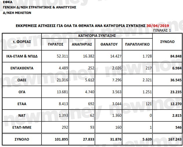 - Μόλις ένα μήνα νωρίτερα (τέλος Απρίλίου) οι εκκρεμείς αιτήσεις στον ΕΦΚΑ για Κύρια Σύνταξη κάθε είδους (δηλαδή όχι μόνον συντάξεις Γήρατος, αλλά και χηρείας, ορφανικές, αναπηρίας και παραπληγικές) ήταν 167.243 συνολικά, και όχι 48.839.