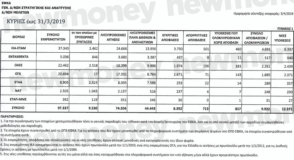 - «Οι εργαζόμενοι στα ασφαλιστικά Ταμεία έκαναν λόγο για «περίπου 100.000 εκκρεμείς αιτήσεις για κύρια σύνταξη. Πιθανότατα εννοούσαν «περίπου 100.000» για Κύρια Σύνταξη Γήρατος, κάτι που επιβεβαιώνεται από το έγγραφο του ΕΦΚΑ το οποίο πιστοποιεί ότι ανέρχονταν σε 101.895 στις 30 Απριλίου, αλλά χωρίς τις λοιπές κατηγορίες Κύριας Σύνταξης. Λόγω της απόκρυψης των ακριβών στοιχεία δεδομένων , φάνηκαν πιο συγκρατημένοι ενδεχομένως στις δημόσιες εκτιμήσεις τους».
