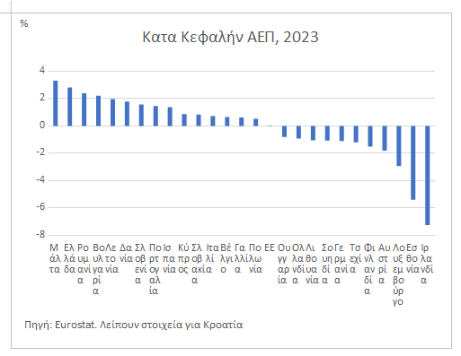 5. Η Ελλάδα είχε την δεύτερη μεγαλύτερη αύξηση του κατά κεφαλήν ΑΕΠ στην Ευρώπη (EE-27). Με βάση της αναθεώρηση του ΑΕΠ, στη διετία 2022-2023 το κατά κεφαλήν ΑΕΠ αυξήθηκε 2,8%, αντί 2,5% που αρχικά εκτιμήθηκε. Συνολικά στην πενταετία, η σωρευτική ανάπτυξη του κατά κεφαλήν πραγματικού ΑΕΠ έφτασε στο 8,7%, αντί 7,8% που ήταν η ως τώρα εκτίμηση.