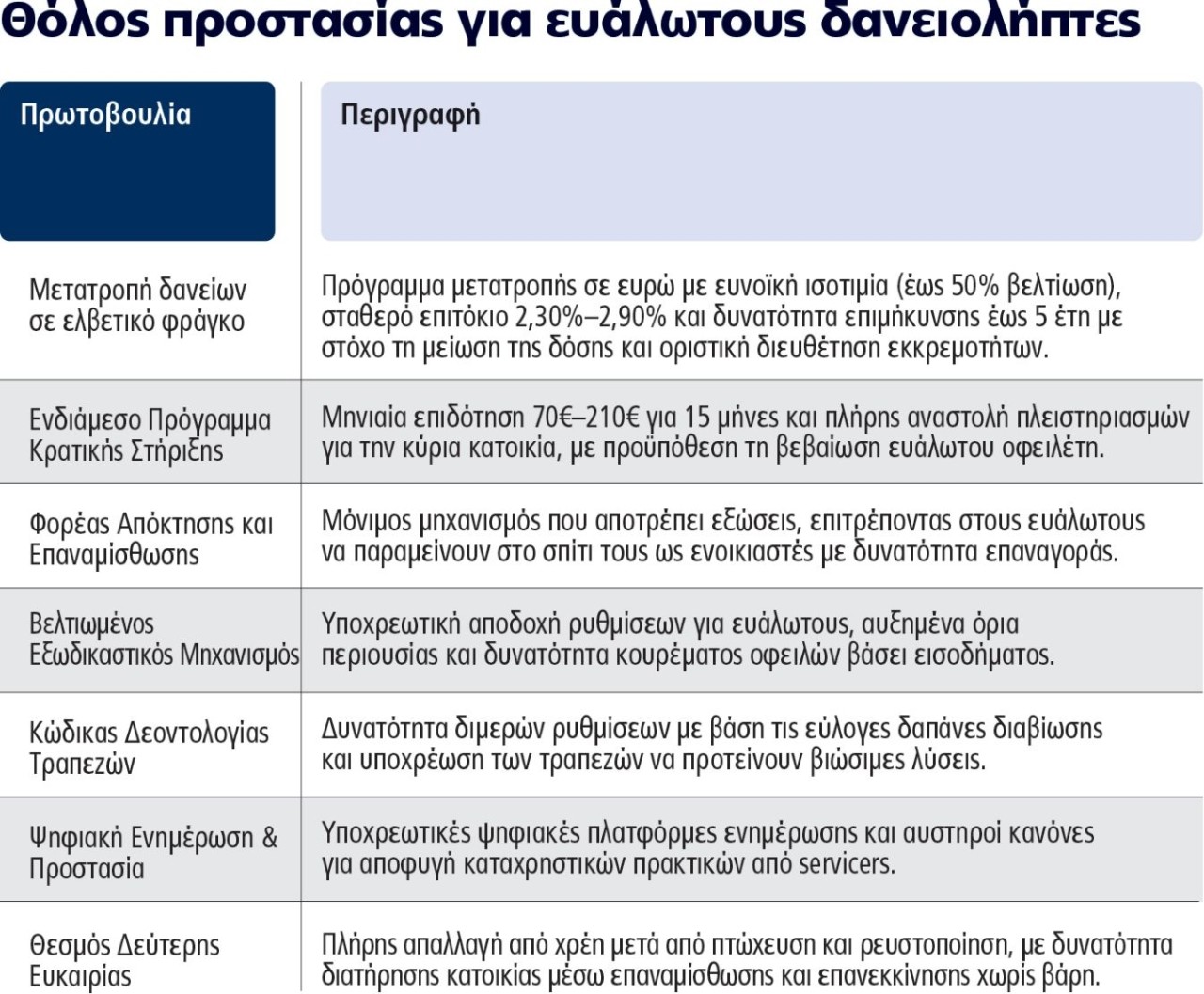 Το πρόγραμμα που θεσπίστηκε στο πλαίσιο του νέου νόμου 5264/2025 προβλέπει τη μετατροπή της οφειλής σε ευρώ με ευνοϊκό υπολογισμό της τρέχουσας ισοτιμίας (έως και 50% βελτιωμένη), ανάλογα με τα εισοδηματικά και περιουσιακά κριτήρια. Προβλέπει ακόμη σταθερό επιτόκιο από 2,30% έως 2,90% για όλη την υπολειπόμενη διάρκεια του δανείου και παράταση της διάρκειάς του έως 5 έτη για περαιτέρω μείωση της δόσης (εφόσον ο χρόνος αποπληρωμής δεν υπερβαίνει το 80ό έτος της ηλικίας του δανειολήπτη). Και όλα αυτά, με κατάργηση των εκκρεμών δικαστικών διαδικασιών.