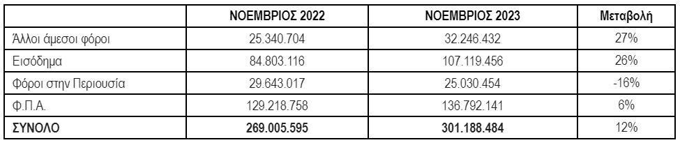 Για τον μήνα αναφοράς (Νοέμβριος) οι συνολικές εισπράξεις έναντι νέου ληξιπρόθεσμου (εκτός 10 Μη Φορολογικών Κατηγοριών) έφτασαν τα 324 εκατ. ευρώ, ενώ την αντίστοιχη περίοδο του 2022 έφτασαν τα 284 εκατ. ευρώ (αύξηση κατά 14%).