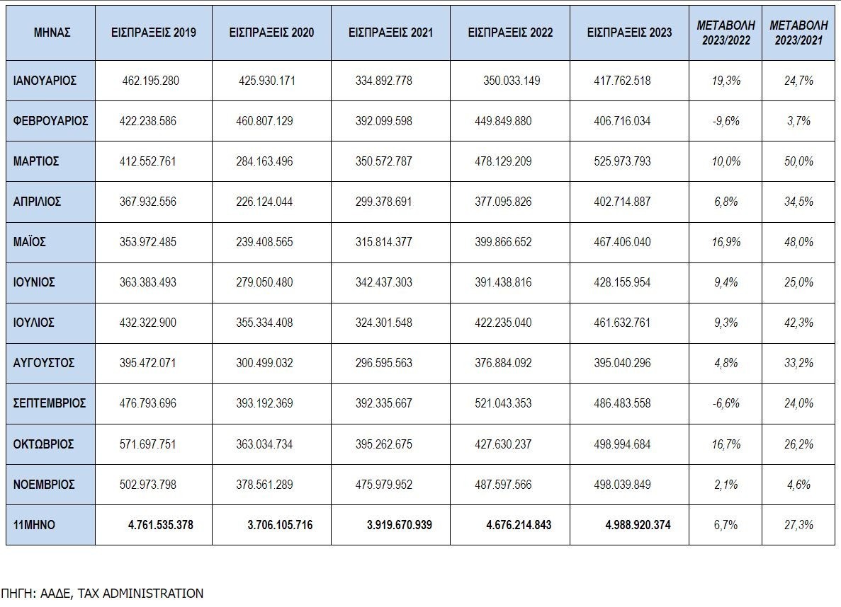 Για το 11μηνο, οι συνολικές εισπράξεις έναντι νέου ληξιπρόθεσμου (εκτός 10 ΜΦΚ) έφτασαν τα 2,231 δισ. ευρώ, ενώ την ίδια περίοδο το 2022 είχαν φτάσει τα 2,202 εκ. ευρώ (οριακή αύξηση).