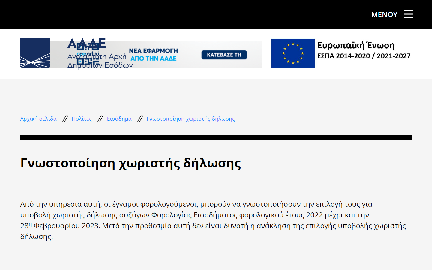 1. Πώς μπορώ να γνωστοποιήσω την επιλογή μου να υποβάλω χωριστή δήλωση φορολογίας εισοδήματος;