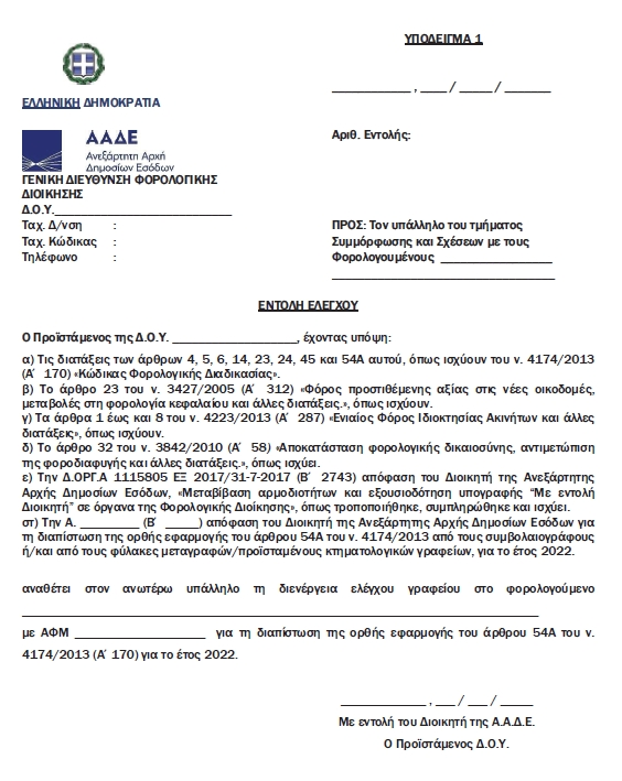 Συγκεκριμένα, σύμφωνα με τη νέα απόφαση Πιτσιλή (Α1100/2022) το έτος 2022 διενεργούνται έλεγχοι γραφείου από τα Τμήματα και Γραφεία Συμμόρφωσης και Σχέσεων με τους Φορολογουμένους των Δημοσίων Οικονομικών Υπηρεσιών (Δ.Ο.Υ.) για τη διαπίστωση της ορθής εφαρμογής της διαδικασίας του άρθρου 54Α του ν. 4174/2013 από συμβολαιογράφους, από υποθηκοφύλακες και από προϊσταμένους των κτηματολογικών γραφείων.