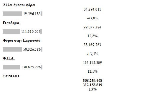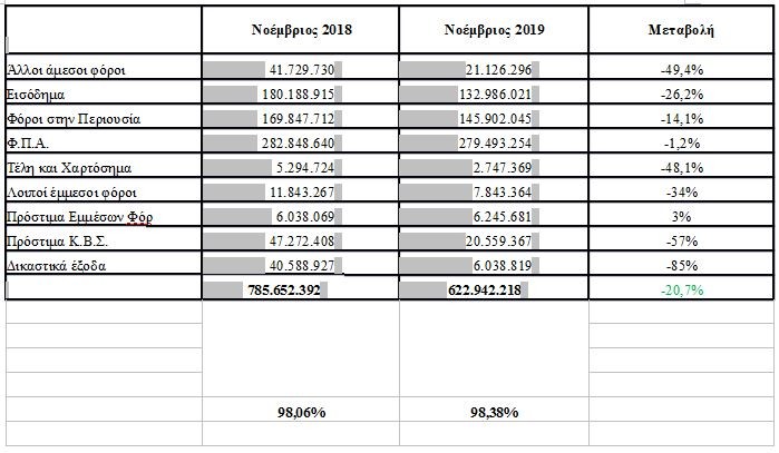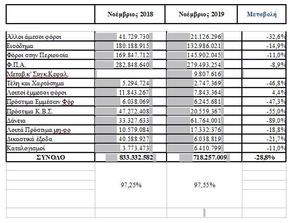 Σε ό,τι αφορά τις εισπράξεις έναντι νέου ληξιπροθέσμου για τον Νοέμβριο (εξαιρουμένων των μη φορολογικών κατηγοριών), έφτασαν τα 336 εκ. (έναντι 326 εκ. την αντίστοιχη περίοδο του 2018) εκ των οποίων το μεγαλύτερο ποσοστό (94%) οφείλεται στις παρακάτω κατηγορίες φόρων: