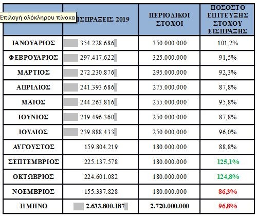 Για το 11μηνο το νέο ληξιπρόθεσμο έφτασε τα 6,467 εκ, ενώ την ίδια περίοδο το 2018 έφτασε τα 7,938εκ (μείωση κατά 18,5%)
