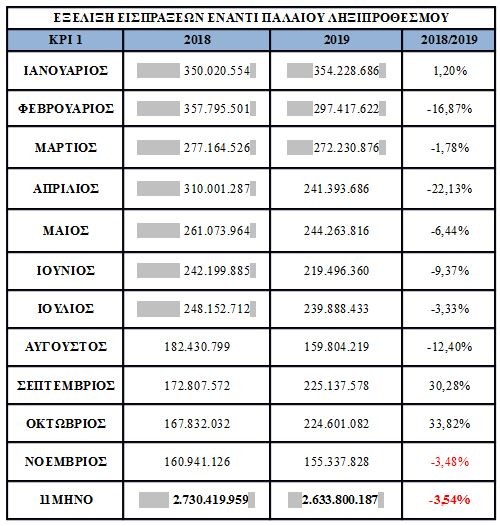 Για το 11μηνο το νέο ληξιπρόθεσμο έφτασε τα 6,467 εκ, ενώ την ίδια περίοδο το 2018 έφτασε τα 7,938εκ (μείωση κατά 18,5%)