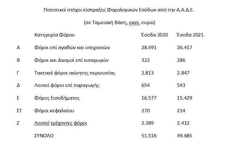 Από την ανάλυση των επιμέρους στόχων προκύπτει οτι ο «πήχης» είσπραξης του ΕΝΦΙΑ παραμένει ίδιος με πέρσι (παρά τις εξαγγελίες για μείωση του φόρου) ενώ ο εισπρακτικός στόχος για τον φόρο εισοδήματος είναι μειωμένος κατά 1 δισ. σε σχέση με το 2020.