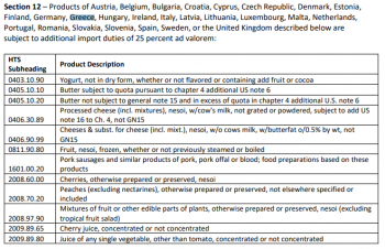 Το ΝΜ αποκαλύπτει τη λίστα προϊόντων που η Ουάσιγκτον θα χτυπήσει με δασμούς 25%. Στη λίστα υπάρχουν συγκεκριμένες αναφορές στην Ελλάδα ως χώρα προέλευσης και ευρείες κατηγορίες προϊόντων που αφορούν το μεγαλύτερο μέρος της γκάμας των Ελληνικών εξαγωγών στις Ηνωμένες Πολιτείες, (γαλακτοκομικά, τυροκομικά, αγροτικά προϊόντα).