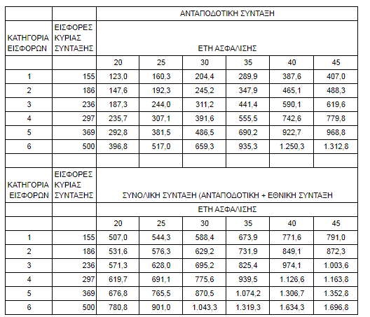 Για παράδειγμα, οι εισφορές κύριας σύνταξης της πρώτης κατηγορίας των 155 ευρώ, αντιστοιχούν σε συντάξιμες αποδοχές 775 ευρώ, οι οποίες με τη σειρά τους «βγάζουν» ανταποδοτική σύνταξη 290 ευρώ και συνολική σύνταξη 674 ευρώ (μαζί με την εθνική των 384 ευρώ) για 35 χρόνια ασφάλισης.