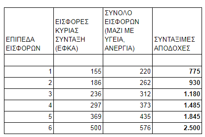 Οι εισφορές της 5ης κατηγορίας (369 ευρώ) αντιστοιχούν σε συντάξιμες αποδοχές 1.845 ευρώ και βγάζουν ανταποδοτική σύνταξη 690 ευρώ και συνολική 1.074 ευρώ.