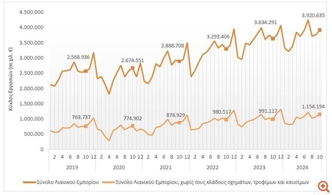 Χωρίς τους κλάδους οχημάτων, τροφίμων και καυσίμων ο κύκλος εργασιών τον Οκτώβριο 2024 ανήλθε σε 0,52 δισ. ευρώ, σημειώνοντας αύξηση 10,2% σε σχέση με τον Οκτώβριο 2023 που είχε διαμορφωθεί σε 0,47 δισ. ευρώ.