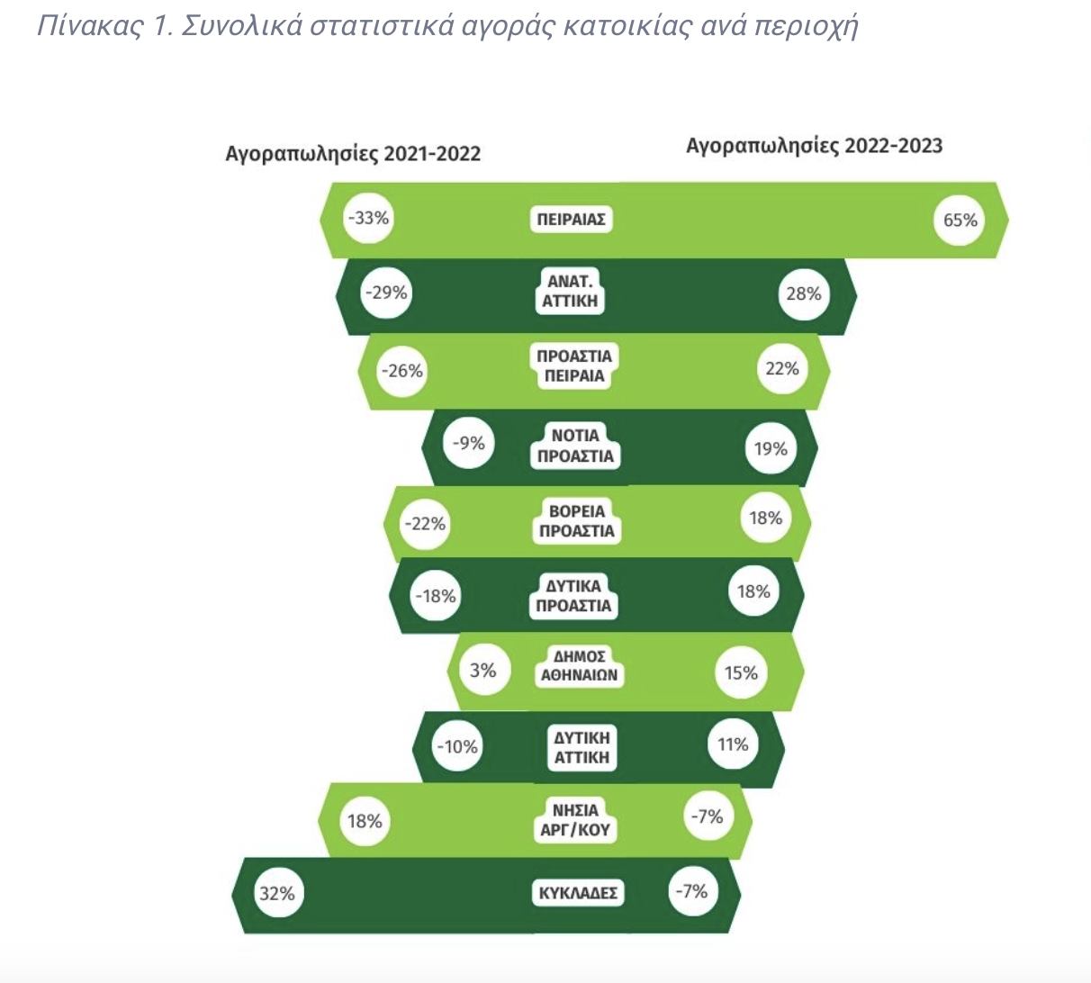 Τα στοιχεία αυτά προκύπτουν από το τελευταίο «Παρατηρητήριο Αγοράς Κατοικιών TOPO GES IKE» όσον αφορά τις αγοραπωλησίες κατοικιών στην Αττική αλλά και σε δημοφιλή νησιά σε Αργοσαρωνικό και Κυκλάδες Η έρευνα αφορά τα πρώτα εξάμηνα (Ιανουάριος-Ιούνιος) των ετών 2021, 2022 και 2023 και τα δεδομένα έχουν συγκεντρωθεί από το Μητρώο Αξιών Μεταβιβάσεων Ακινήτων.
