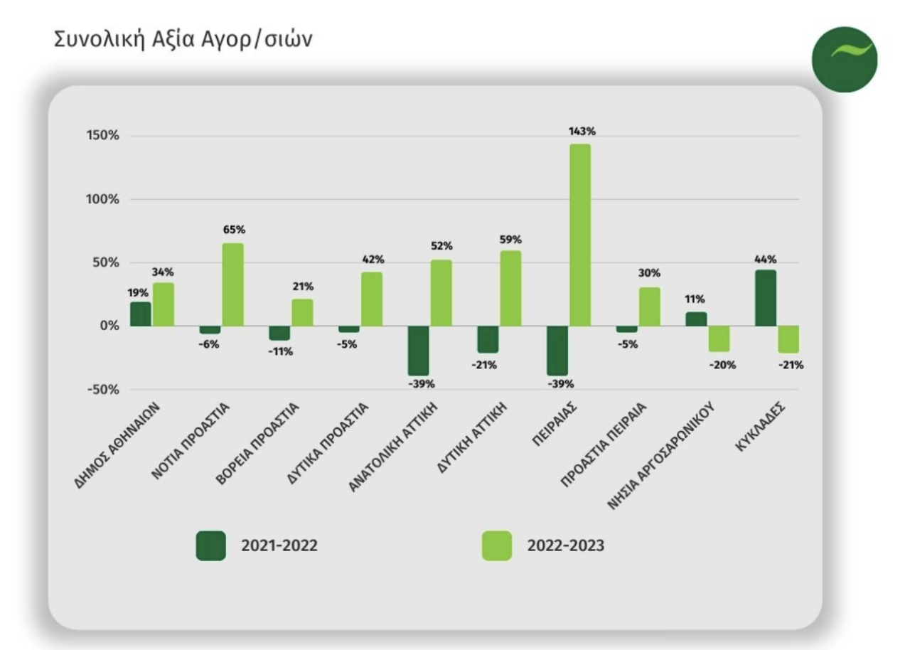 Στις περιοχές των βορείων προαστίων, στην Ανατολική και Δυτική Αττική, στον Πειραιά και στα προάστιά του το πρώτο εξάμηνο του 2022 καταγράφηκε πτώση του αριθμού και της αξίας των αγοραπωλησιών. Ωστόσο, το 2023 οι αγοραπωλησίες δείχνουν να ανακάμπτουν και να αυξάνονται με γοργούς ρυθμούς. Ενδεικτικά μετά τον Πειραιά, ακολουθεί με ένα +28% στις αγοραπωλησίες φέτος η Ανατολική Αττική και στο +18% τα βόρεια και τα δυτικά προάστια. Τη δυναμική τους διατηρούν σταθερά τα νότια με +19% ως προς τις αγοραπωλησίες και +65% ως προς τις αξίες. Ανοδο καταγράφεται παντού ως προς τις αξίες, με τη μεγαλύτερη, όπως προαναφέρθηκε στον Πειραιά (+143%), ενώ και τα δυτικά προάστια δεν πάνε πίσω αν ληφθεί υπόψη το +59% σε σχέση με το πρώτο εξάμηνο του 2022.