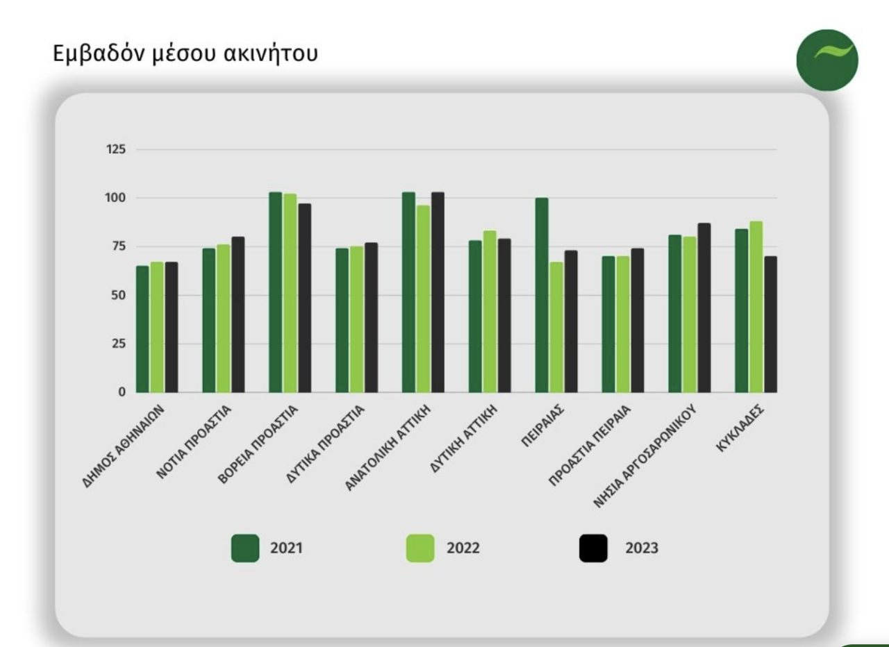 Αναφορικά με το εμβαδόν των πωληθέντων κατοικιών, από την έρευνα προκύπτει ότι στις περιοχές που εντάσσονται στο δήμο Αθηναίων για το πρώτο εξάμηνο του 2023 η μέση κατοικία κατασκευάστηκε το 1971 και έχει εμβαδόν 67 τ.μ. Στα νότια προάστια το εμβαδόν της είναι 80 τ.μ. και έχει ηλικία 41 έτη και στα βόρεια η επιφάνεια του μέσου ακινήτου είναι 97 τ.μ. και η ηλικία του 34 έτη. Στα δυτικά προάστια το έτος κατασκευής της μέσης κατοικίας ήταν το 1982 και η επιφάνειά της 77 τ.μ., ενώ στην Ανατολική Αττική η χρονολογία κατασκευής του μέσου ακινήτου είναι το 1992 και το εμβαδόν του 103 τ.μ. Το ίδιο διάστημα, η μέση κατοικία που πωλήθηκε στη Δυτική Αττική έχει ηλικία 34 έτη και εμβαδόν 79 τ.μ. Στο κέντρο του Πειραιά προκύπτει πως η ηλικία του μέσου ακινήτου είναι τα 41 έτη και η επιφάνειά του τα 73 τ.μ.. Συγχρόνως, στα προάστια Πειραιά η μέση κατοικία κατασκευάστηκε το 1983 και έχει εμβαδόν 74 τ.μ. Όσον αφορά τα νησιά του Αργοσαρωνικού, το μέσο πωληθέν ακίνητο έχει ηλικία 52 έτη και εμβαδόν 87 τ.μ., ενώ στις Κυκλάδες 53 έτη και εμβαδόν 87 τ.μ.