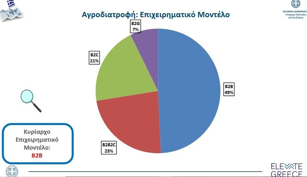 Το «προφίλ» των εταιρειών που έχουν ενταχθεί στην πλατφόρμα του Elevate Greece, δείχνει ότι το επιχειρηματικό μοντέλο που επιλέγεται από τις εταιρείες που ασχολούνται με την αγροτεχνολογία, είναι το B2B σε ποσοστό άνω του 49%, ενώ στον αντίποδα το μοντέλο B2G επιλέγει το 6% των επιχειρήσεων. Ενδιαμέσως B2C διαλέγει το 21% των εταιρειών και B2B2C το 23%.