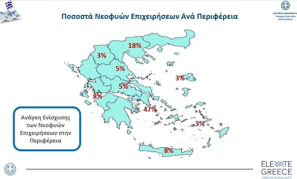 Συγκεκριμένα ο κ. Δήμας σημειώνει: «Η κατανομή του 47% των νεοφυών επιχειρήσεων του αγροδιατροφικού τομέα στην περιφέρεια Αττικής είναι ένα στοιχείο που μας απασχολεί, καθώς η ανάπτυξη της ελληνικής οικονομίας δεν είναι μια υπόθεση που αφορά μόνο τα αστικά κέντρα, αλλά το σύνολο της επικράτειας. Ήδη μελετάται ένα στοχευμένο πλέγμα πολιτικών, μέσω της συνεργασίας του Elevate Greece με τις περιφέρειες ώστε να ενισχυθούν οι νεοφυείς επιχειρήσεις, που βρίσκονται εκτός των αστικών κέντρων και απασχολούνται στον πρωτογενή τομέα».