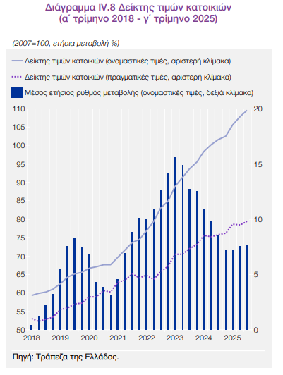 Στην αγορά κατοικιών, σημαντικοί ετήσιοι ρυθμοί αύξησης στις τιμές των διαμερισμάτων συνέχισαν να καταγράφονται σε επίπεδο χώρας έως και το γ΄ τρίμηνο του 2025, ωστόσο με σημαντική επιβράδυνση έναντι των αντίστοιχων τριμήνων του προηγούμενου έτους. Με βάση τα στοιχεία εκτιμήσεων που συλλέγονται από την Τράπεζα της Ελλάδος, το εννεάμηνο του 2025 οι τιμές των διαμερισμάτων αυξήθηκαν κατά 7,5%, έναντι αύξησης κατά 9,7% το αντίστοιχο διάστημα του 2024.