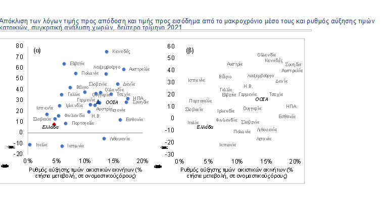 Ο λόγος τιμής προς απόδοση στην Ελλάδα ήταν, το δεύτερο τρίμηνο του 2021, από τους χαμηλότερους, μεταξύ των χωρών που απεικονίζονται στο Γράφημα 3α, καθώς η ετήσια άνοδος των τιμών των ακινήτων ξεπέρασε οριακά την αύξηση των ενοικίων. Όσον αφορά στον λόγο τιμής προς διαθέσιμο εισόδημα, η αγορά ακινήτων στην Ελλάδα βρίσκεται μαζί με μία μικρή ομάδα χωρών (όπως η Ιταλία και η Πολωνία) κάτω του μακροχρόνιου μέσου, έστω και οριακά. Η αγορά κατοικίας, το τρέχον διάστημα, είναι σχετικώς προσιτή, καθώς ο ρυθμός αύξησης των τιμών υπολείπεται του ρυθμού αύξησης του διαθεσίμου εισοδήματος (ο ρυθμός αύξησης του ακαθάριστου διαθεσίμου εισοδήματος διαμορφώθηκε στο 5,1% κατά το πρώτο τρίμηνο του έτους και στο 7% το δεύτερο τρίμηνο, έναντι αύξησης 3,5% και 4,6% αντίστοιχα, στις τιμές των οικιστικών ακινήτων).