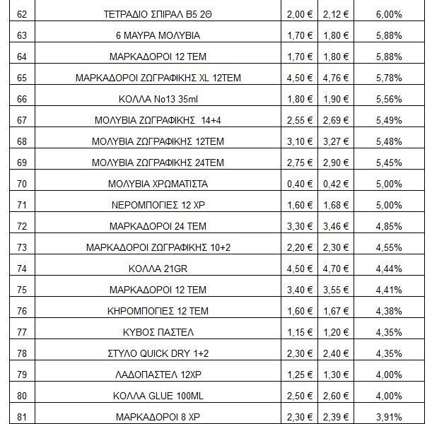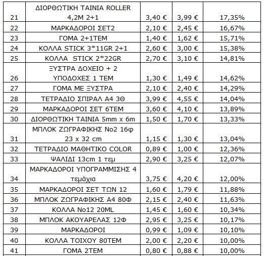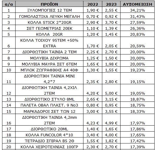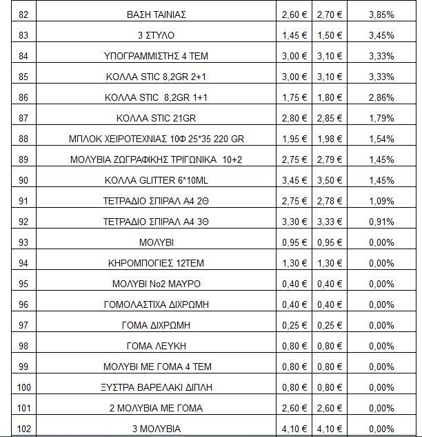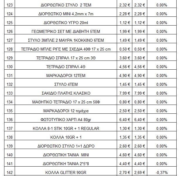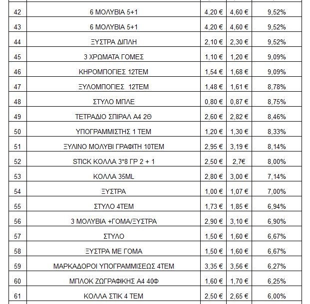 Ακολουθεί ο πίνακας με τις αυξομειώσεις των σχολικών ειδών: