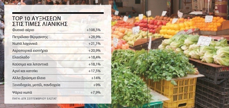 Οι τιμές των νωπών λαχανικών εμφανίζονται αυξημένες κατά 21,1% σε σχέση με πέρυσι, του ελαιολάδου 18,4%, του αρνιού και του κατσικιού 17,5% και των λοιπών βρώσιμων ελαίων κατά 14%.