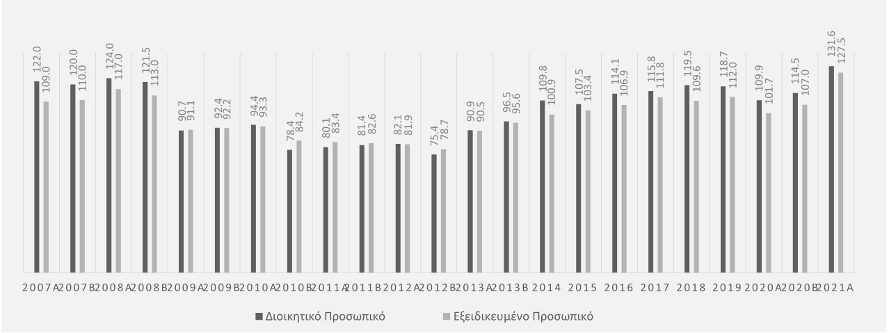 Παράλληλα, ο δείκτης εξειδικευμένου και στελεχιακού προσωπικού αυξήθηκε κατά 20,5 μονάδες, ξεπερνώντας τις 120 μονάδες. Τα στοιχεία αυτά έχουν ιδιαίτερη σημασία, ιδίως εάν λάβουμε υπόψιν ότι ο δείκτης RCI διαχρονικά εμφανίζεται να «προβλέπει» την εξέλιξη των βασικών μακροοικονομικών μεγεθών της χώρας μας.
