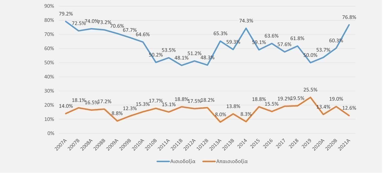 Παράλληλα, τα στελέχη των ελληνικών επιχειρήσεων εμφανίζονται πιο αισιόδοξα (σχεδόν) από ποτέ (δεύτερο υψηλότερο ποσοστό μετά την πρώτη μέτρηση το 2007!), ενώ ιστορικά χαμηλά κατέγραψαν και οι απαισιόδοξες απαντήσεις, οδηγώντας στο 4ο χαμηλότερο ποσοστό απαισιοδοξίας από την αρχή διεξαγωγής της έρευνας στην Ελλάδα.