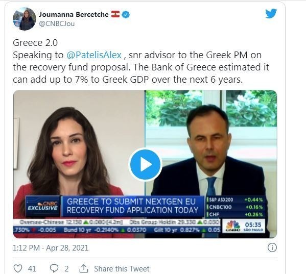 Speaking to @PatelisAlex , snr advisor to the Greek PM on the recovery fund proposal. The Bank of Greece estimated it can add up to 7% to Greek GDP over the next 6 years. pic.twitter.com/WEYROXzUOq— Joumanna Bercetche 🇱🇧 (@CNBCJou) April 28, 2021