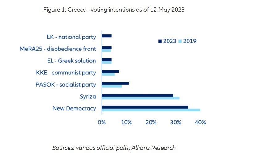 Τα αποτελέσματα των εκλογών στην Ελλάδα στις 21 Μαΐου θα είναι καθοριστικά για το αν η χώρα θα μπορέσει να διατηρήσει τη βιωσιμότητα του χρέους και να επιστρέψει στην επενδυτική βαθμίδα μέχρι το τέλος του έτους, επισημαίνει η γερμανική Allianz.