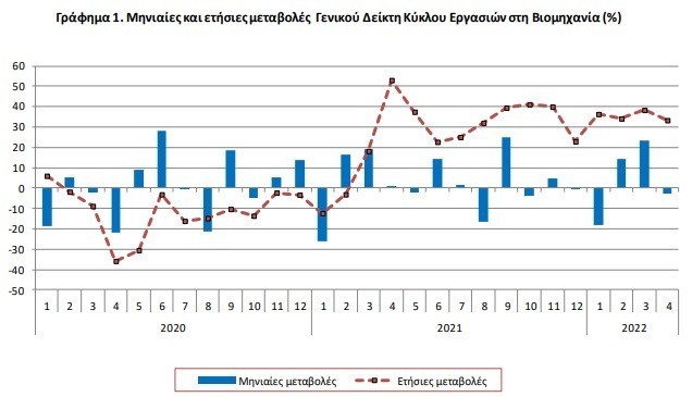 - Ο γενικός δείκτης κύκλου εργασιών στη Βιομηχανία (σύνολο εγχώριας και εξωτερικής αγοράς), σε σύγκριση με τον αντίστοιχο δείκτη του Απριλίου 2021 (ετήσια βάση), παρουσίασε αύξηση 33,3%
