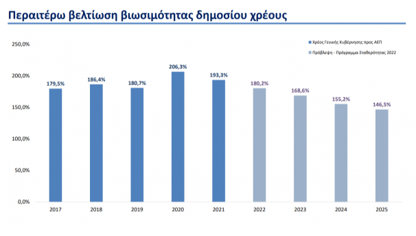 Για το δημόσιο χρέος, η πρόβλεψη δείχνει ραγδαία μείωση, από 193,3% πέρυσι σε 180,2% του ΑΕΠ φέτος και 168,6% το 2023, πριν πέσει περαιτέρω στο 2024 στο 155,2% και στο 146,5% το 2025.