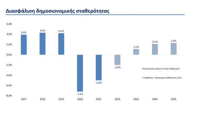 Η νεότερη πρόβλεψη εμπεριέχεται και στο νέο Πρόγραμμα Σταθερότητας 2022-2025, το οποίο θα σταλεί τις επόμενες ώρες στις Βρυξέλλες. Και σύμφωνα με αυτήν, από το 2023 προβλέπεται επιστροφή ξανά σε πρωτογενή πλεονάσματα, της τάξεως όμως μόλις 1,1% αλλά και με προοπτική για σταθερά χαμηλά πλεονάσματα και το 2024 και το 2025, κατά 2,1% και 2,3% αντίστοιχα.