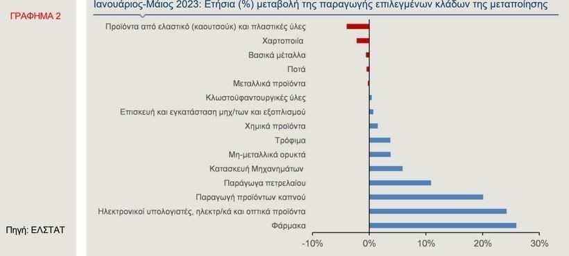 Οσον αφορά στους επιμέρους κλάδους της μεταποίησης με βάση τη στάθμισή τους, η πλειονότητά τους κατέγραψε αύξηση της παραγωγής το πρώτο πεντάμηνο του 2023, με την υψηλότερη να έχει σημειωθεί στην παραγωγή φαρμάκων, ηλεκτρονικών υπολογιστών, ηλεκτρονικών και οπτικών προϊόντων, καθώς και στην παραγωγή προϊόντων καπνού και παραγώγων πετρελαίου. Αντίθετα, οι μεγαλύτερες μειώσεις σημειώθηκαν στην παραγωγή προϊόντων από ελαστικό και πρώτες ύλες και στη χαρτοποιία, ενώ μικρές μειώσεις καταγράφηκαν στην παραγωγή μεταλλικών προϊόντων, βασικών μετάλλων και ποτών. Σημειώνεται ότι με βάση τα τελευταία διαθέσιμα στοιχεία της ΕΛΣΤΑΤ, το πρώτο τρίμηνο του έτους ο κύκλος εργασιών και η απασχόληση στη μεταποίηση κατέγραψαν αύξηση κατά 8,9% και 2,6% σε ετήσια βάση.