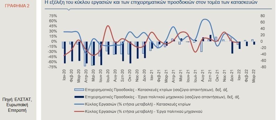 Οι επιχειρηματικές προσδοκίες στις ιδιωτικές κατασκευές (κατασκευή κτιρίων) κινήθηκαν έντονα πτωτικά, κατά τους πρώτους μήνες της πανδημίας, ενώ εν συνεχεία βελτιώθηκαν και πέρασαν σε θετικό έδαφος, τους τελευταίους τέσσερις μήνες του 2021 (Γράφημα 2). Τον Μάρτιο του 2022, ο εν λόγω δείκτης διαμορφώθηκε σε 6 μονάδες, βελτιωμένος σημαντικά σε σύγκριση με τον Ιανουάριο (-10 μονάδες), αλλά και με τον Φεβρουάριο (4 μονάδες). Οι επιχειρηματικές προσδοκίες στις δημόσιες κατασκευές (έργα πολιτικού μηχανικού) επίσης κινήθηκαν ανοδικά, κατά τη διάρκεια του 2021, αλλά επέστρεψαν σε αρνητικό έδαφος, από τον Νοέμβριο του 2021 και μετά, φθάνοντας, τον Μάρτιο του 2022, τις -10 μονάδες, ελαφρώς βελτιωμένες, ωστόσο, σε σύγκριση με τον Φεβρουάριο (-14 μονάδες).