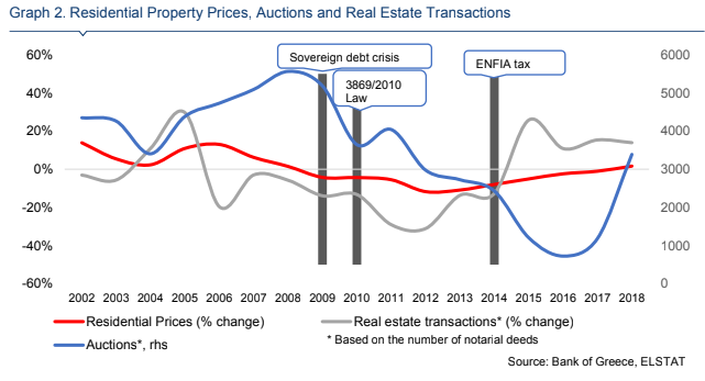 Η ελληνική αγορά ακινήτων έχει εισέλθει ξεκάθαρα σε ανοδική τροχιά. Οι τιμές των κατοικιών αυξήθηκαν κατά 7,4% το πρώτο εννιάμηνο του 2019 σε σχέση με την αντίστοιχη περίοδο του 2019. Στην Αθήνα η αύξηση των τιμών άγγιξε το 10,3% – λόγω airbnb και “χρυσής visa”. Η ανάκαμψη ωστόσο δεν έχει καταφέρει να καλύψει παρά ένα μικρό κομμάτι των απωλειών λόγω της δεκαετούς κρίσης στην αγορά ακινήτων.