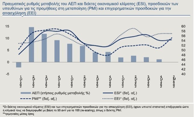 Οι εκτιμήσεις αυτές υποστηρίζονται από την πορεία των πρόδρομων δεικτών οικονομικής δραστηριότητας (Δείκτης Οικονομικού Κλίματος και PMI στη μεταποίηση), τους τελευταίους μήνες του 2023 και το δίμηνο Ιανουαρίου-Φεβρουαρίου του 2024. Πιο αναλυτικά, ο δείκτης προσδοκιών των υπευθύνων για τις προμήθειες στη μεταποίηση (Purchasing Managers’ Index-PMI) διαμορφώθηκε στις 55,7 μονάδες, τον Φεβρουάριο του 2024, που αποτελεί την υψηλότερη τιμή από τον Μάρτιο του 2022 και μετά, όταν κατέγραψε σημαντική κάμψη εξαιτίας της ρωσικής εισβολής στην Ουκρανία (Γράφημα 2). Ο PMI ενισχύθηκε, κυρίως, από τη μεγάλη αύξηση στις νέες παραγγελίες και την παραγωγή, η οποία είναι η υψηλότερη που έχει καταγραφεί την τελευταία διετία. Παράλληλα, εξαιτίας της ενισχυμένης ζήτησης καταγράφηκε ισχυρή αύξηση της απασχόλησης και μείωση των αποθεμάτων. Στο τελευταίο συνέβαλαν και οι πρόσφατες εντάσεις στην Ερυθρά Θάλασσα, που οδήγησαν στην αύξηση του μέσου χρόνου παράδοσης των εμπορευμάτων αλλά και στην αύξηση των τιμών εισροών.