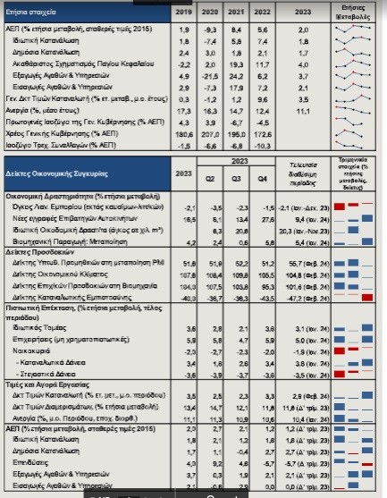 Τέλος, η στατιστική επίδραση βάσης (carry-over effect) του ρυθμού μεγέθυνσης του 2023 επί του προσδοκώμενου ετήσιου ρυθμού μεγέθυνσης του 2024 -η οποία υπολογίζεται ως η ποσοστιαία διαφορά μεταξύ του επιπέδου του ΑΕΠ στο τέταρτο τρίμηνο του 2023 και του μέσου επιπέδου του ίδιου έτους- εκτιμάται στο 0,3%.