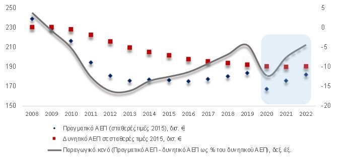 Κατά τη διάρκεια της τρέχουσας πανδημικής κρίσης, η μεγάλη και απότομη πτώση της ζήτησης, λόγω των περιοριστικών μέτρων, της αβεβαιότητας και του φόβου επιμόλυνσης, είχε την ανάλογη επίπτωση στο πραγματικό ΑΕΠ της χώρας μας, το οποίο, το 2020, εκτιμάται ότι θα διαμορφωθεί σε πολύ χαμηλότερο επίπεδο συγκριτικά με την ύφεση της προηγούμενης δεκαετίας. Ωστόσο, το δυνητικό ΑΕΠ, το οποίο ήδη βρίσκεται σε χαμηλό επίπεδο, εξαιτίας της αποεπένδυσης και του brain drain που έλαβαν χώρα κατά την παρατεταμένη ύφεση της περασμένης δεκαετίας, προβλέπεται ότι θα υποχωρήσει σημαντικά λιγότερο σε σύγκριση με το πραγματικό ΑΕΠ, στο τρέχον έτος, οδηγώντας σε επιδείνωση του παραγωγικού κενού που είναι η διαφορά μεταξύ πραγματικού και δυνητικού ΑΕΠ. Η εξέλιξη αυτή διαμορφώνει ένα σκηνικό αδύναμης ενεργού ζήτησης και ερμηνεύει, σε μεγάλο βαθμό, την πτωτική τάση του γενικού επιπέδου τιμών καταναλωτή, η οποία διαμορφώθηκε σε -1,1% στο πρώτο ενδεκάμηνο του έτους, σε ετήσια βάση.