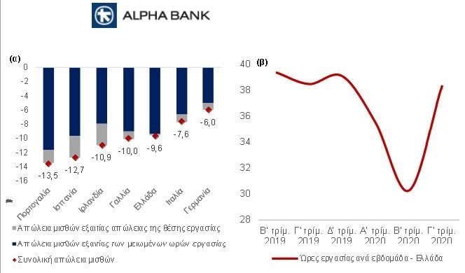 Τρίτον, η αύξηση των απουσιών από την εργασία και η πτώση των ωρών εργασίας αποτελούν τους κύριους παράγοντες της μείωσης του εισοδήματος από την εργασία, κατά το τρέχον έτος, καθώς τα μέτρα που υιοθέτησε η Ελληνική Κυβέρνηση για τη στήριξη της απασχόλησης είχαν ως αποτέλεσμα την άμβλυνση των επιπτώσεων -σε γενικές γραμμές- στις θέσεις εργασίας (μόλις -1%, σε ετήσια βάση, το πρώτο εννεάμηνο του 2020) και, ως εκ τούτου, τη συγκράτηση του ποσοστού της ανεργίας. Στο πλαίσιο ορισμένων εξ αυτών των μέτρων, όπως π.χ. το πρόγραμμα “ΣΥΝ-ΕΡΓΑΣΙΑ” για την ενίσχυση της απασχόλησης (συμπεριλαμβανομένης και της εποχικής απασχόλησης), ή το μέτρο αναστολής συμβάσεων εργασίας, αυξήθηκαν σημαντικά οι απουσίες από την εργασία και, ως εκ τούτου, μειώθηκε ο αριθμός των ωρών εργασίας ανά εβδομάδα, όπως παρουσιάζεται στο Γράφημα 2β. Συγκεκριμένα, το δεύτερο τρίμηνο του 2020, διάστημα κατά το οποίο ήταν σε πλήρη ισχύ τα εν λόγω μέτρα, οι ώρες εργασίας διαμορφώθηκαν, κατά μέσο όρο, σε 30,3, έναντι 39,4 ώρες, το ίδιο τρίμηνο του 2019. Το τρίτο τρίμηνο του 2020, ωστόσο, μετά τη σταδιακή άρση των περιοριστικών μέτρων και δεδομένου ότι μέρος μόνο των έκτακτων μέτρων στήριξης ήταν σε εφαρμογή, για συγκεκριμένους κλάδους που πλήττονταν από την πανδημία, οι ώρες εργασίας ανέκαμψαν στο αντίστοιχο περσινό επίπεδο (38,4 ώρες, ανά εβδομάδα, έναντι 38,5 ώρες, το τρίτο τρίμηνο του 2019).