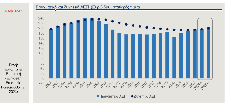 Τα χρόνια που προηγήθηκαν της οικονομικής κρίσης, το πραγματικό ΑΕΠ υπερέβαινε το δυνητικό, καταγράφοντας τις υψηλότερες τιμές τους, το μεν πραγματικό ΑΕΠ το 2007 (Ευρώ 240 δισ.), το δε δυνητικό το 2009 (Ευρώ 236 δισ.). Κατά τη διάρκεια της οικονομικής κρίσης, ο συνδυασμός παρατεταμένης αποεπένδυσης και εκροής καταρτισμένου εργατικού δυναμικού αποδυνάμωσε τις παραγωγικές δυνατότητες της ελληνικής οικονομίας, ενώ η εσωτερική υποτίμηση που συντελέστηκε είχε ως αποτέλεσμα τη ραγδαία μείωση της εγχώριας ζήτησης και, κατά συνέπεια, του πραγματικού ΑΕΠ. Η οικονομική δραστηριότητα ανακάμπτει από το 2017 -με εξαίρεση το 2020 εξαιτίας της πανδημίας-, με το πραγματικό ΑΕΠ να προσεγγίζει τα Ευρώ 194,5 δισ. το 2023, ενώ η πτωτική πορεία του δυνητικού ΑΕΠ ανακόπηκε μόλις την τελευταία διετία, για να διαμορφωθεί σε Ευρώ 194 δισ. το περασμένο έτος (Γράφημα 3). Ως αποτέλεσμα, το έντονα αρνητικό παραγωγικό κενό της περασμένης δεκαετίας εξαλείφθηκε, ενώ το 2023 καταγράφηκε θετικό παραγωγικό κενό για πρώτη φορά από το 2008.