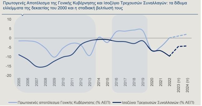 Όπως αναφέρουν οι αναλυτές τις τράπεζας, μία από τις παθογένειες της ελληνικής οικονομίας, την περίοδο πριν από την οικονομική κρίση, ήταν το φαινόμενο των «δίδυμων ελλειμμάτων», δηλαδή το αρνητικό δημοσιονομικό αποτέλεσμα, όπως αυτό αποτυπώνεται στο πρωτογενές ισοζύγιο της Γενικής Κυβέρνησης (ΓΚ), και η εξαιρετικά ελλειμματική κατάσταση του ισοζυγίου τρεχουσών συναλλαγών (ΙΤΣ).