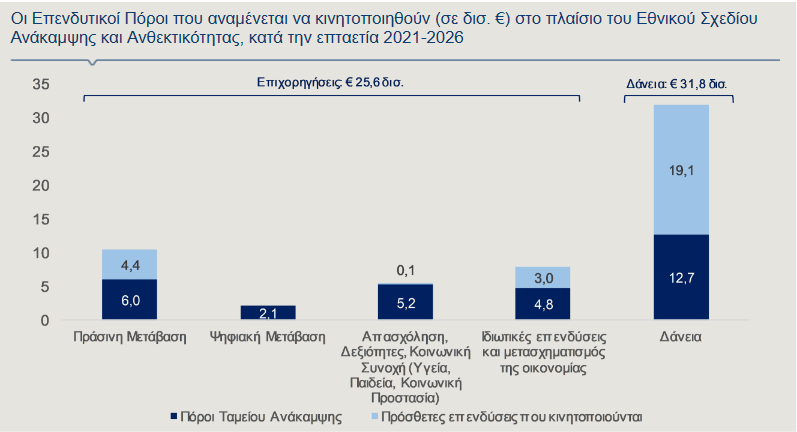 Επιπρόσθετα Ευρώ 2,1 δισ. θα κατευθυνθούν σε επενδύσεις για τον ψηφιακό μετασχηματισμό του κράτους και των επιχειρήσεων αλλά και για τη συνδεσιμότητα, περί τα Ευρώ 5,3 δισ. θα αξιοποιηθούν για την ενίσχυση της απασχόλησης και της κοινωνικής συνοχής (υγεία, παιδεία, κοινωνική προστασία) και Ευρώ 7,8 δισ. για ιδιωτικές επενδύσεις και διαρθρωτικές μεταρρυθμίσεις για το μετασχηματισμό της οικονομίας (φορολογικά εργαλεία πιο φιλικά για την ανάπτυξη και τη βελτίωση της φορολογικής διοίκησης, εκσυγχρονισμός της δημόσιας διοίκησης, βελτίωση της αποτελεσματικότητας του συστήματος δικαιοσύνης, εκσυγχρονισμός και βελτίωση της ανθεκτικότητας κύριων κλάδων οικονομίας της χώρας κ.λπ.). Τέλος, τα δάνεια του Ταμείου Ανάκαμψης, με τη συμμετοχή του τραπεζικού συστήματος, αλλά και επενδυτών (κατά τουλάχιστον 30% και 20%, αντιστοίχως), αναμένεται να ανέλθουν, συνολικά, σε Ευρώ 32 δισ.