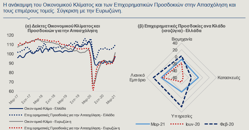 Σε βραχύτερο χρονικό ορίζοντα, η αξιοσημείωτη αύξηση του αριθμού των εμβολιασμών, η παράταση των δημοσιονομικών μέτρων στήριξης για όσο διάστημα κρίνεται απαραίτητο, σε συνδυασμό με την επικείμενη, σταδιακή άρση των περιοριστικών μέτρων, είναι παράγοντες που μετριάζουν την αβεβαιότητα, εξέλιξη που αποτυπώθηκε στην ήπια βελτίωση του Δείκτη Οικονομικού Κλίματος και των Επιχειρηματικών Προσδοκιών, τον Μάρτιο 2021.