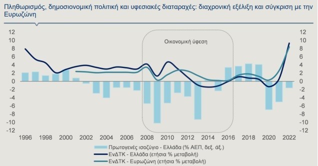 Από το φθινόπωρο του 2021 και μετά, οι διαταραχές στις εφοδιαστικές αλυσίδες, ως αποτέλεσμα της πανδημικής κρίσης, η αναζωπύρωση της ζήτησης για αγαθά και υπηρεσίες και κυρίως η ενεργειακή κρίση, η οποία επιδεινώθηκε από τη ρωσική εισβολή στην Ουκρανία, τροφοδότησαν το άλμα του πληθωρισμού, τόσο στην Ελλάδα, όσο και στην Ευρωζώνη. Παράλληλα, έντονες πληθωριστικές πιέσεις σημειώθηκαν και στα τρόφιμα, καθώς η Ρωσία και η Ουκρανία είναι από τους μεγαλύτερους παραγωγούς σιταριού σε παγκόσμιο επίπεδο.